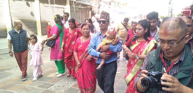 काठमाडौंको असनमा बुधबार असं चालंका रुपमा सबैभन्दा कनिष्ठ बालकलाई थाकुली बनाएर पायाः (खड्ग जात्रा) निकालेको छ ।