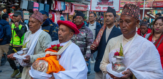 चाँगुनारायणका मूल पूजारी चक्रधरानन्द राजोपाध्यायले चाँगुनारायणको कलश र दायाँबायाँ भँडेलहरुले लक्ष्मी, सरस्वतीको कलश चाँगुबाट बोकेर पैदल हिँड्दै काठमाडौंको हनुमानढोका स्थित तलेजु ल्याए ।