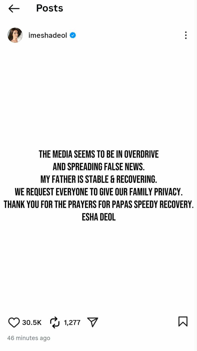 भारतीय सञ्चारमाध्यममा अभिनेता धर्मेन्द्रको निधन भएको खबर सार्वजनिक भइरहँदा इशाले उनको स्वास्थ्यमा सुधार भइरहेको बताएकि हुन् ।