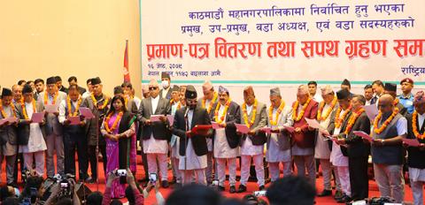 काठमाडौं महानगरपालिका नव प्रमुख, उपप्रमुख, वडाअध्यक्ष र सदस्यहरुले पद तथा गोपनियताको सपथ ग्रहण गरेको छ । महानगरका एक सय ६० जनप्रतिनिधिले पद तथा गोपनीयताको शपथ लिनुभएको छ । राष्ट्रिय सभागृहमा महानगर प्रमुख वालेन्द्र साह, उपप्रमुख सुनिता डङ्गोल...